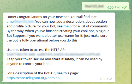 Si el nombre de usuario no está en uso, BotFather te felicitará y te enviará el token para acceder a la API HTTP. Para crear el bot, necesitas el token. Cualquiera puede usarlo para controlarlo. Por lo tanto, debes mantenerlo seguro y guardarlo de forma segura. Ahora, copia el token de acceso.
