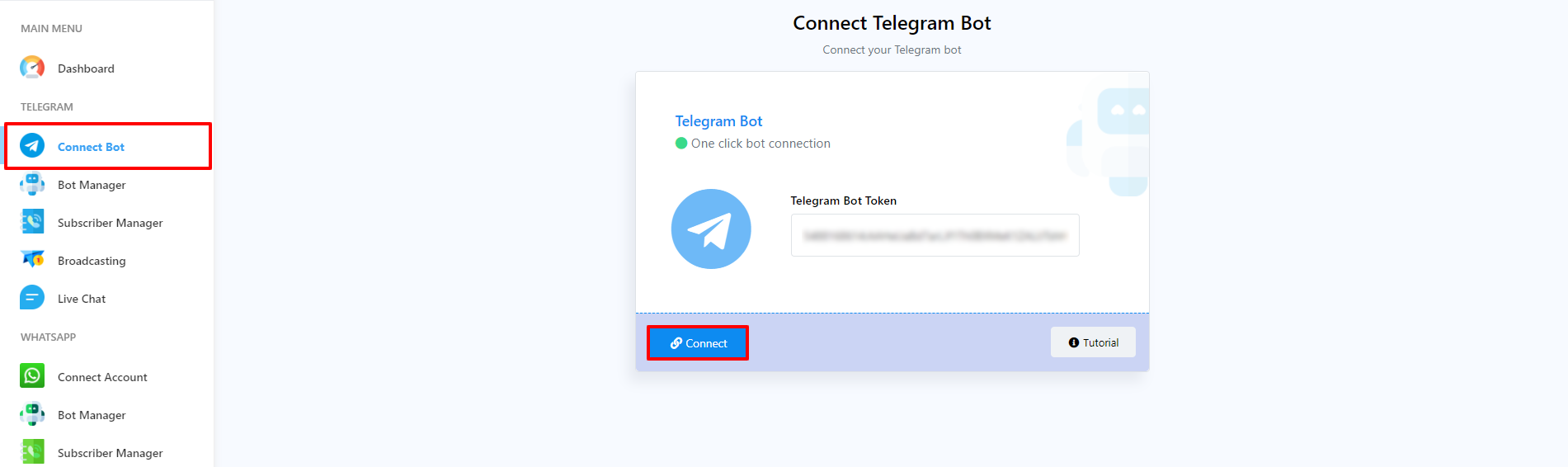 Ve al menú "Conectar bot". Ahora debes ingresar el token del bot que recibiste de botfather en el campo "Token del bot de Telegram". Después de ingresarlo, haz clic en el botón "Conectar bot".