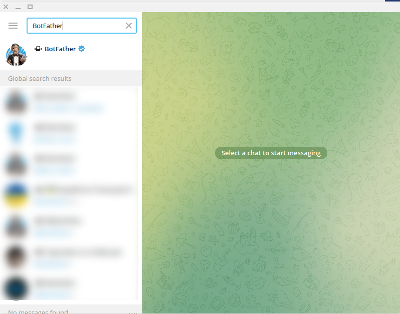 Para crear un bot de Telegram con Andes Chat Bot - Powered by Visual Chile, primero abre tu app de Telegram. En la barra de búsqueda, busca "BotFather". Después, selecciona la cuenta verificada de BotFather.