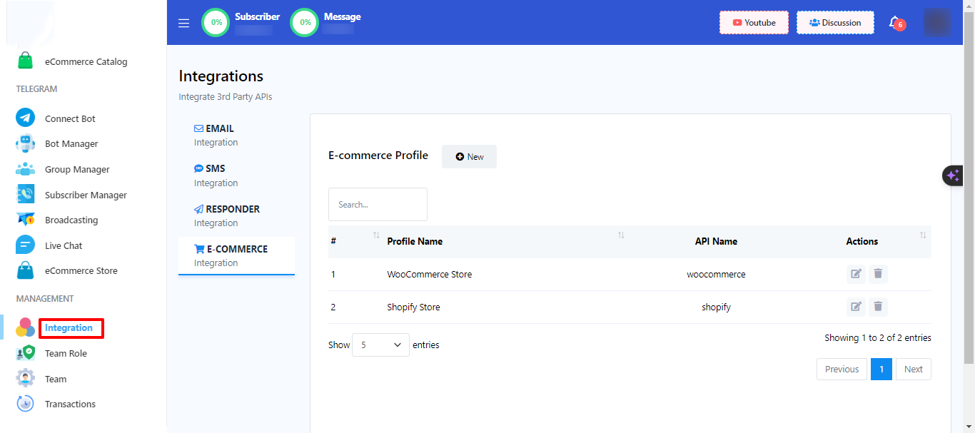 - Dentro del menú Integración, haga clic en la categoría “E-Commerce”.