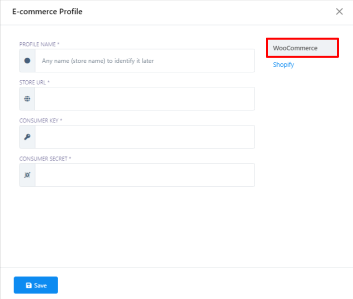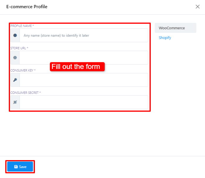 - Ahora, completa el formulario para crear tu perfil de WooCommerce. Encontrarás la información necesaria en tu cuenta de WooCommerce.