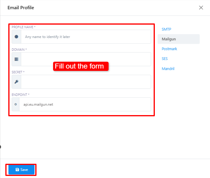 - Ahora, completa el formulario para crear tu perfil de Mailgun. La información necesaria para completarlo se encuentra en tu cuenta de Mailgun.