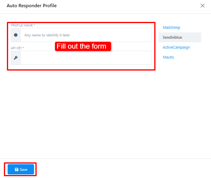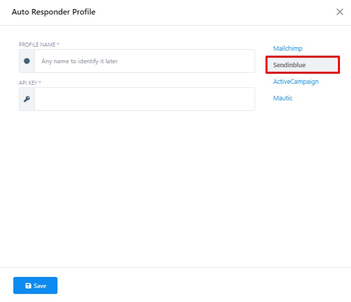 - Para esta guía, demostraremos el proceso utilizando Sendinblue como proveedor de servicios de respuesta. Por lo tanto, haga clic en la opción "Sendinblue".