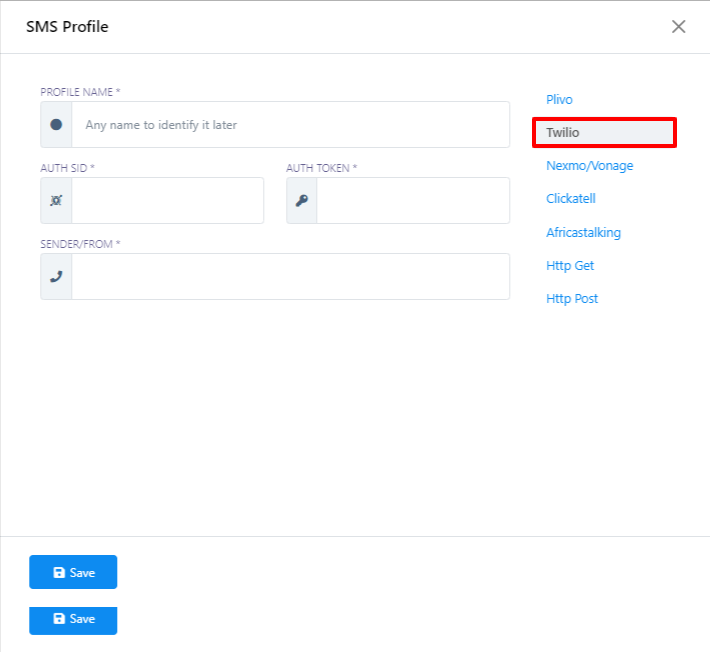 - Para esta guía, demostraremos el proceso utilizando Twilio como proveedor de servicios SMS. Por lo tanto, haga clic en la opción "Twilio".