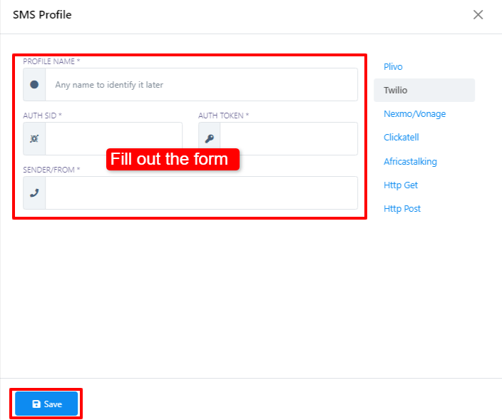 - Ahora, completa el formulario para crear tu perfil de Twilio. Encontrarás la información necesaria en tu cuenta de Twilio.
