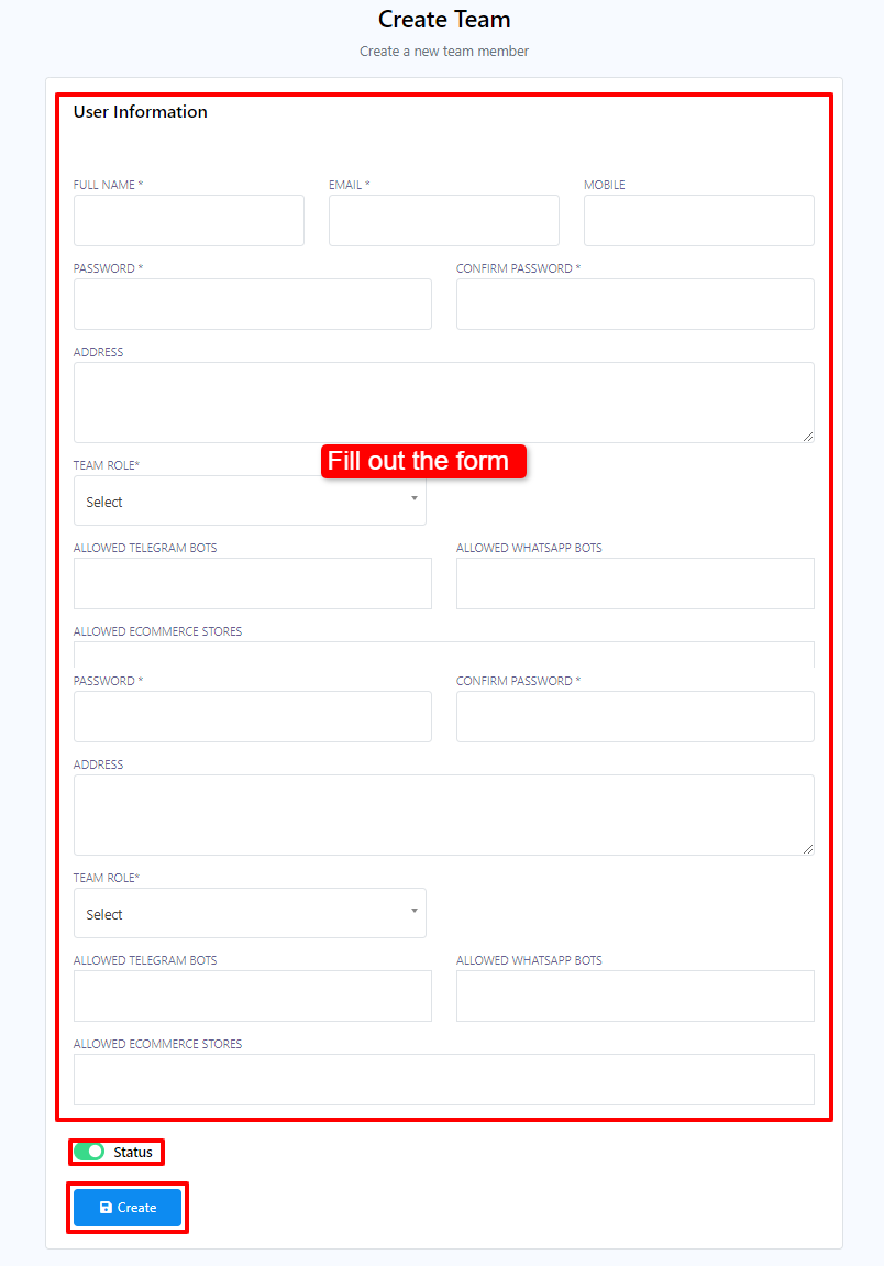 - Complete el formulario de información de usuario. Ingrese su nombre completo, correo electrónico, teléfono móvil, contraseña, dirección, rol en el equipo, bots de Telegram permitidos, bots de WhatsApp permitidos y tiendas de comercio electrónico permitidas.