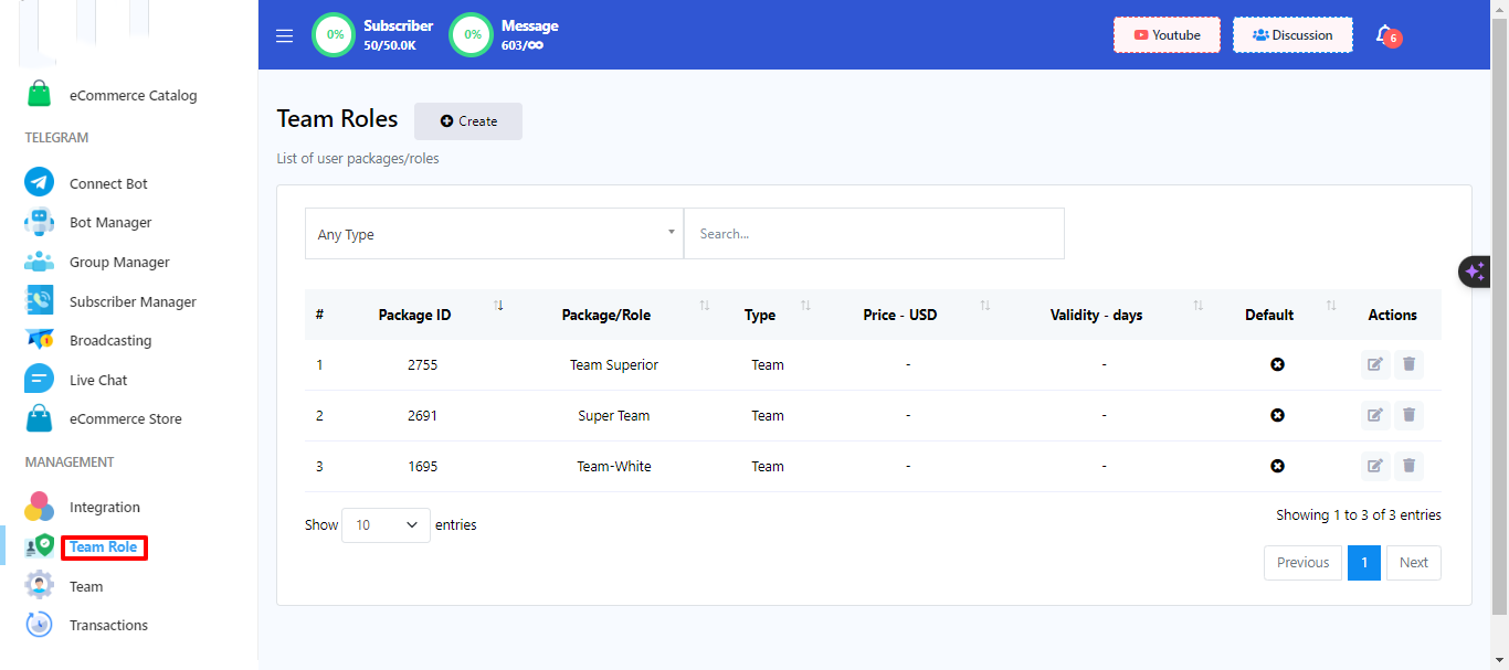 - Dentro del menú Rol del equipo, haga clic en el botón "Crear".