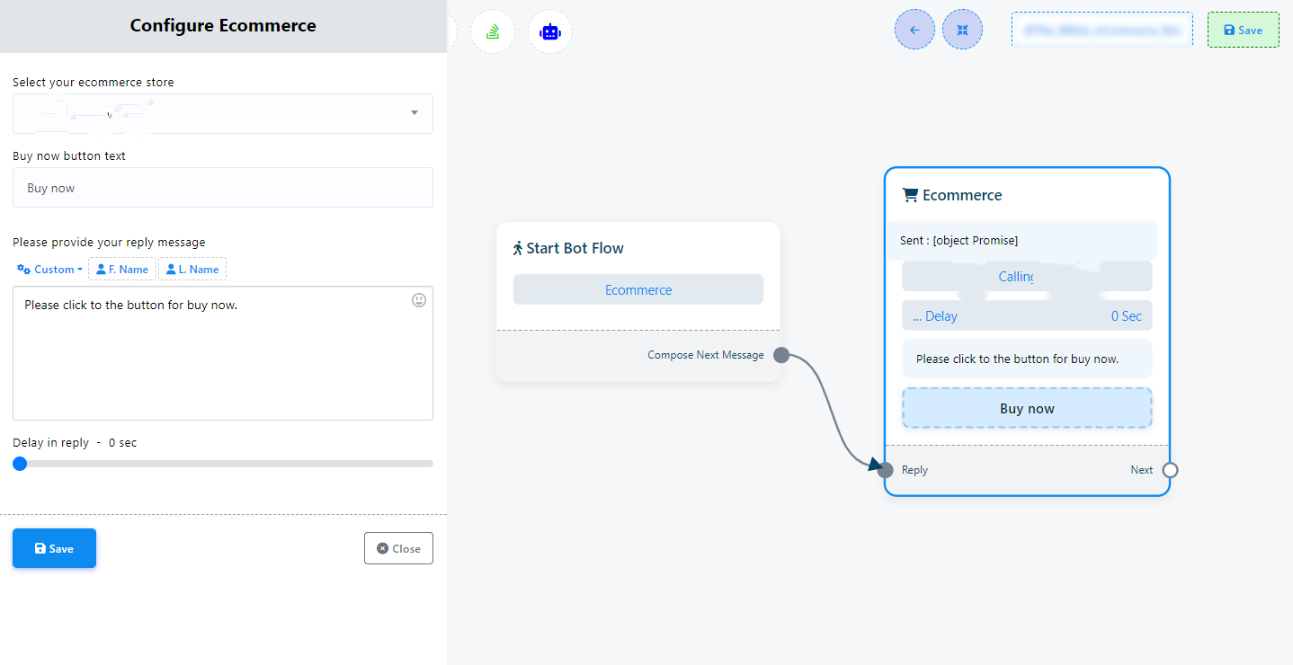 El componente de Comercio Electrónico es una función intuitiva de arrastrar y soltar que facilita una integración fluida entre tu bot de Telegram y una tienda online. Esta potente función te permite crear una experiencia de tienda online completa directamente desde la interfaz de tu bot de Telegram. (Encontrarás más información sobre Comercio Electrónico en la sección de Comercio Electrónico de la documentación).