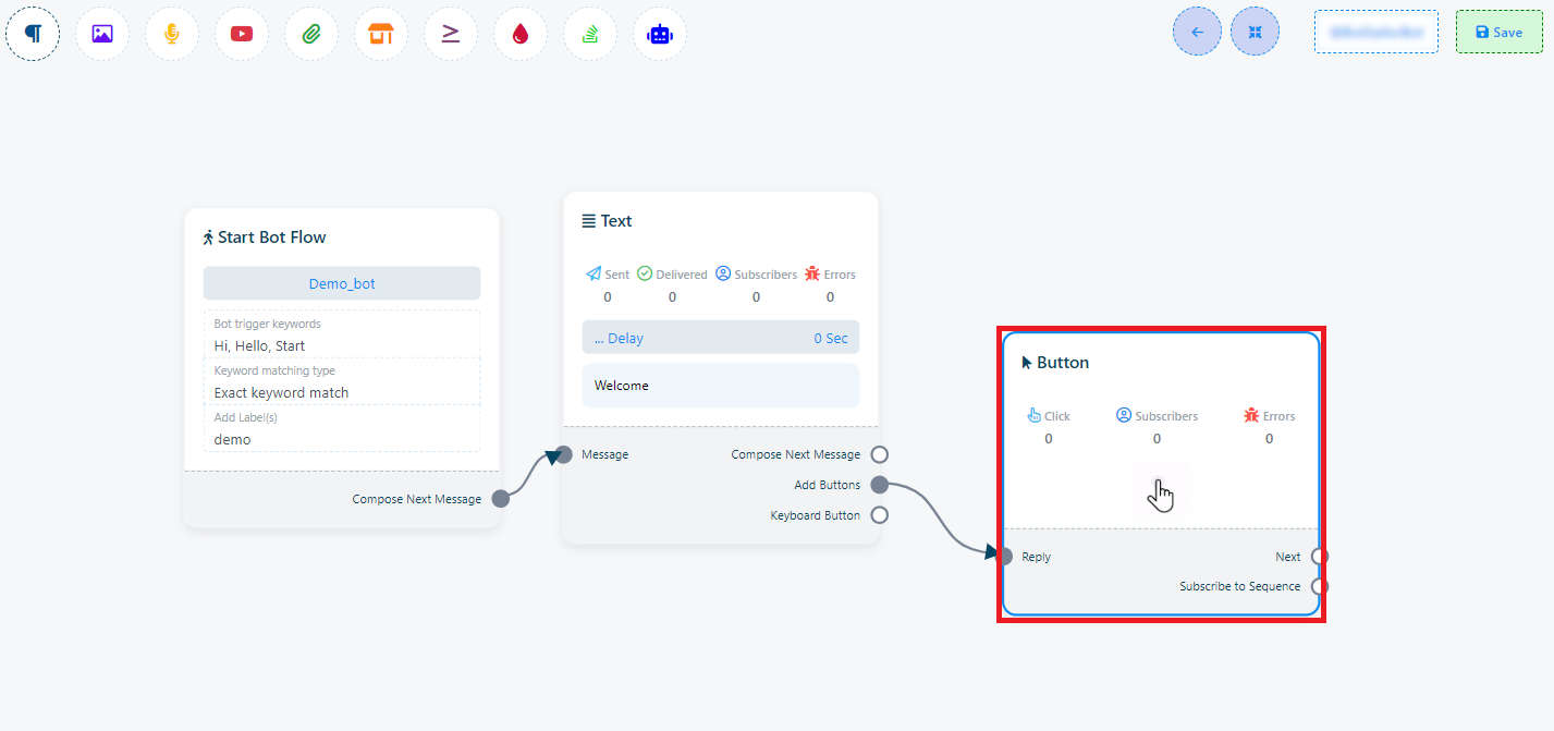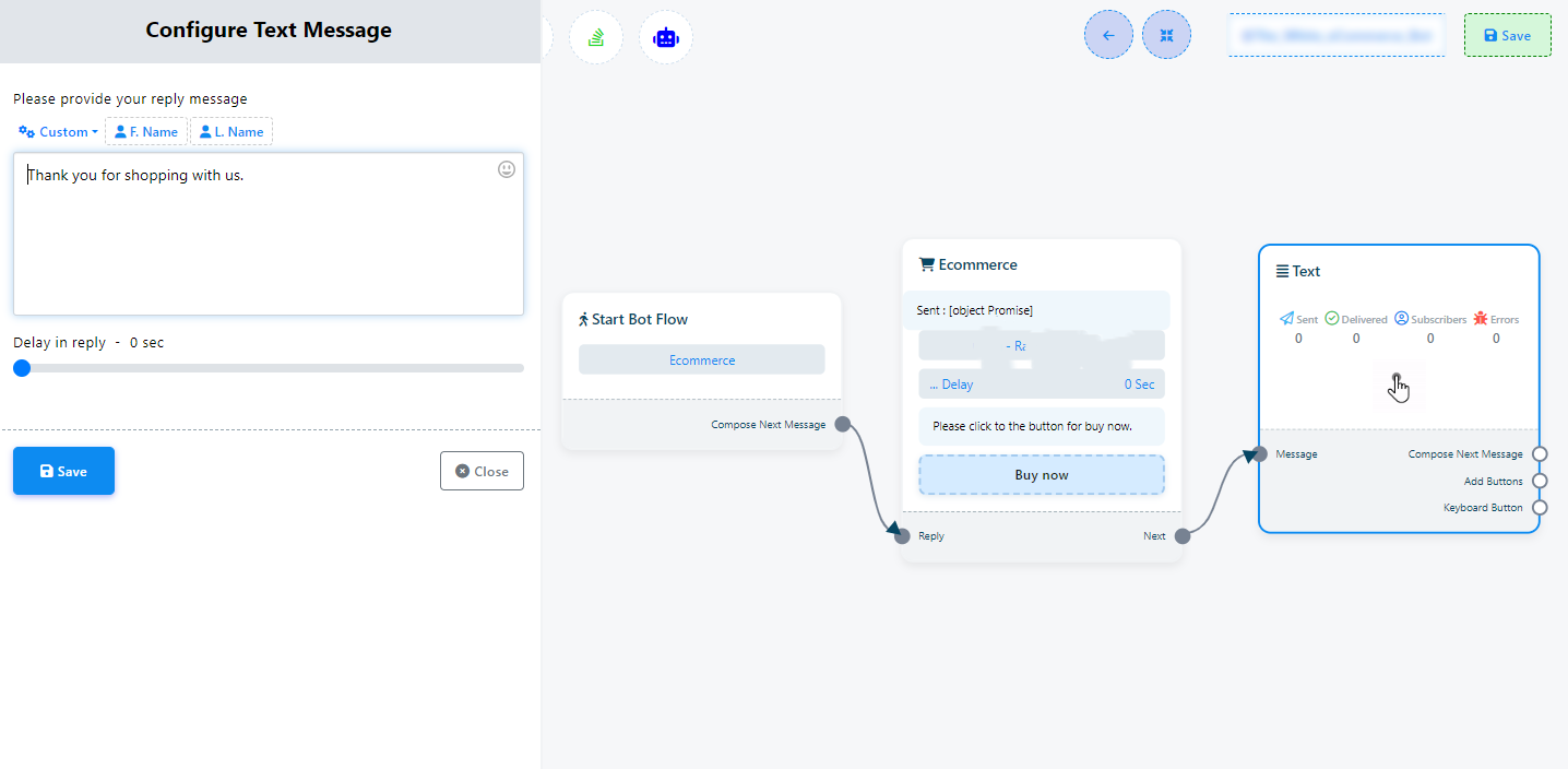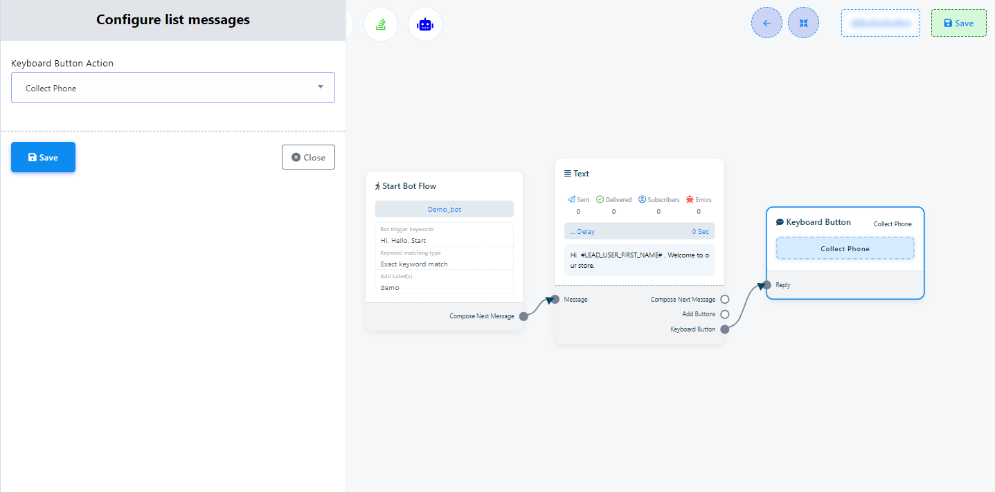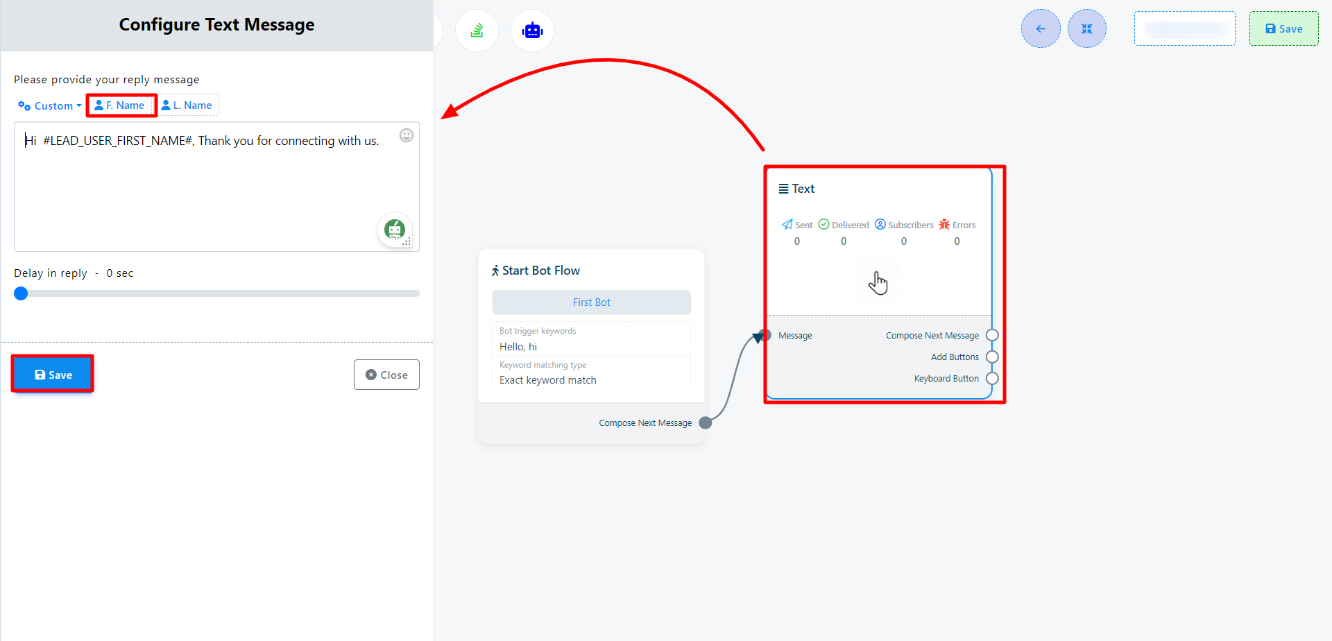 Ahora haga clic en el botón Guardar y la información aparecerá en el componente. A continuación, conecte el componente de texto con el componente Iniciar flujo de bot.
