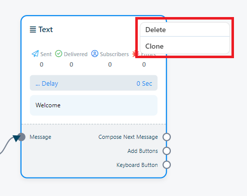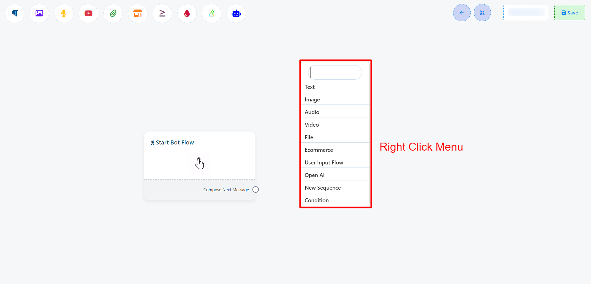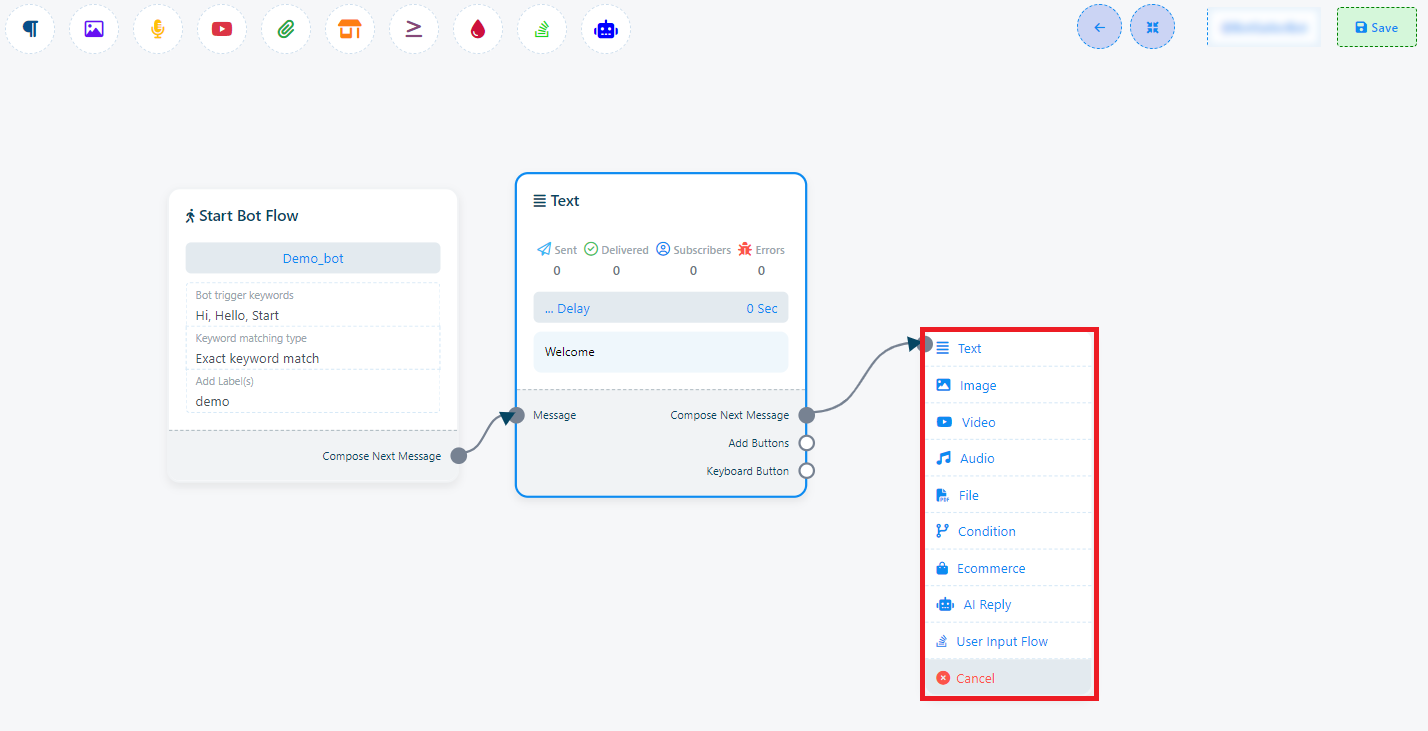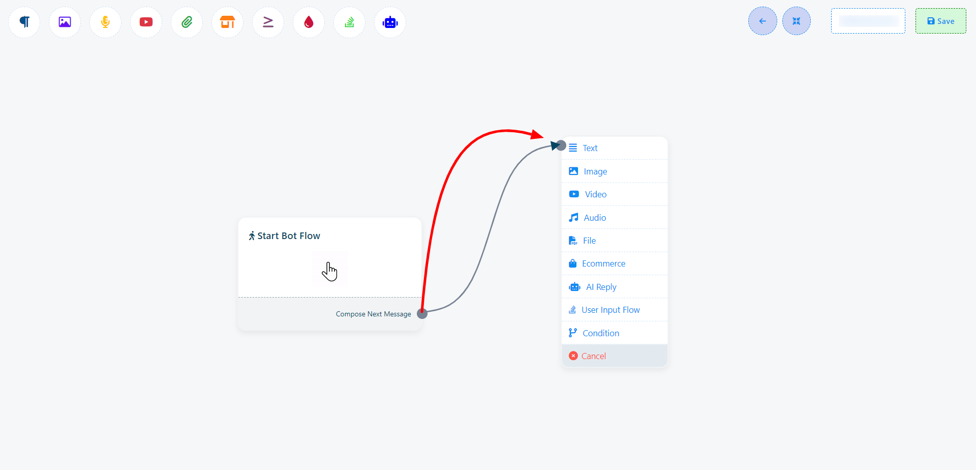 Por ejemplo, supongamos que arrastra desde el siguiente socket de salida del componente de texto. Esto activará un menú desplegable con diferentes componentes como Texto, Imagen, Vídeo, Audio, Archivo, Comercio electrónico, Flujo de entrada del usuario y un botón Cancelar. En este menú desplegable, puede seleccionar el componente deseado. Si desea cancelar y no agregar ningún componente, simplemente haga clic en el botón Cancelar.