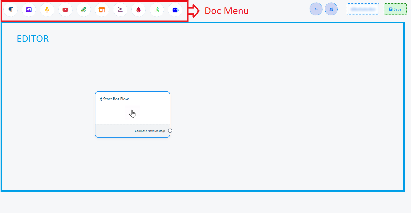 Una vez abierto el Generador de Flujos, verá que todos los componentes están convenientemente consolidados en la esquina superior izquierda de la pantalla, en el "Menú superior". Al mismo tiempo, en la sección "Editor", verá que el componente "Iniciar Flujo de Bot" ya está precargado para su comodidad.