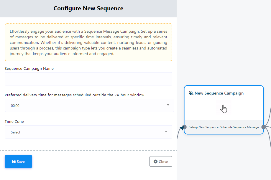 - Haga doble clic en "Nuevas Campañas de Secuencia". En este paso, especifique un nombre para su Campaña de Secuencia completando el campo "Nombre de la Campaña de Secuencia".