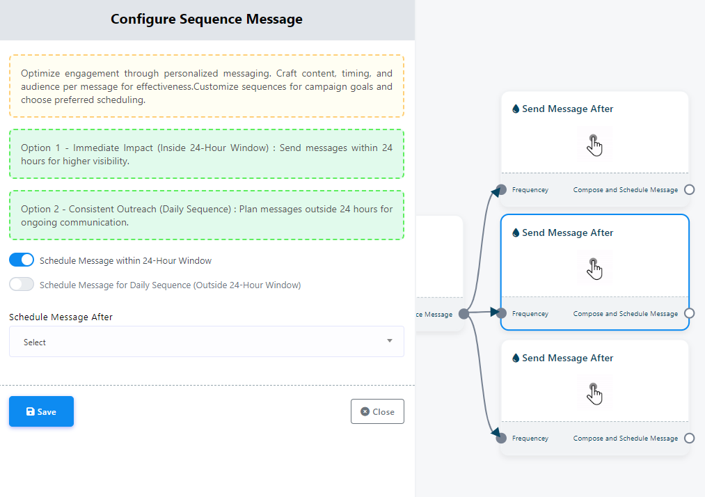 - El componente "Programar Mensaje Después de" permite programar los mensajes dentro de un día. Haga clic en el menú emergente para acceder a las horas predefinidas o, alternativamente, puede definir manualmente la hora de programación.