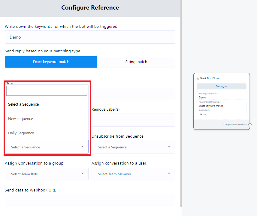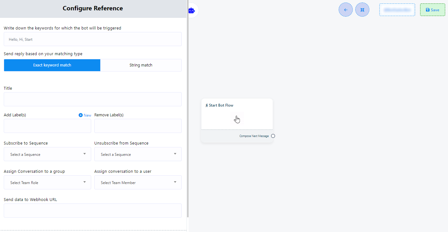 - Activación por palabras clave: Para iniciar el bot con palabras clave específicas, haga doble clic en el elemento "Iniciar flujo de bot". Esta acción abrirá la barra lateral izquierda "Configurar referencia", con diez campos y dos botones. En el campo de palabras clave, añada palabras clave y sepárelas con comas si añade más de una. Cuando un usuario introduzca texto en la ventana de mensajería que coincida con cualquiera de estas palabras clave, el bot se activará.