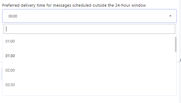 - Para determinar el horario de entrega de sus mensajes en serie, utilice el campo "Hora de entrega preferida para mensajes programados fuera del período de 24 horas". Puede elegir entre horarios preestablecidos o introducir manualmente su hora de entrega preferida.