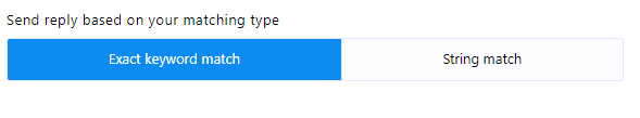 - Tipo de coincidencia: Puede elegir el tipo de coincidencia haciendo clic en uno de los dos botones disponibles: "Coincidencia exacta de teclado" o "Coincidencia de cadena". Por defecto, se selecciona "Coincidencia exacta de teclado". Con esta opción, el bot solo se activará si la entrada del usuario coincide exactamente con la palabra clave. Por el contrario, con "Coincidencia de cadena", el bot se activará si la entrada del usuario coincide parcialmente con la palabra clave.