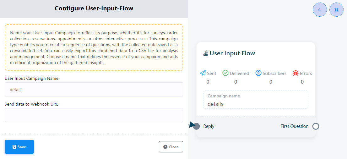 El Flujo de Entrada de Usuario es una potente función que facilita la recopilación de datos de los usuarios mediante interacciones naturales y conversacionales. Con esta función, puede crear flujos interactivos para plantear preguntas a los usuarios y almacenar sus respuestas en campos personalizados. Los datos recopilados pueden utilizarse para personalizar las experiencias de usuario, segmentar a los suscriptores o exportar información a un archivo CSV.