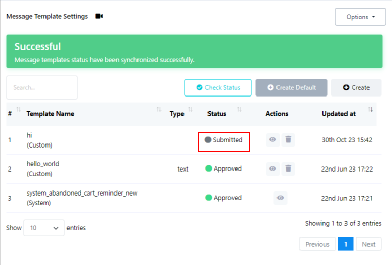 Después de guardar, la plantilla recién creada aparecerá en la sección Plantillas, pero su estado inicial será "Enviada". Tenga en cuenta que la aprobación de la plantilla puede tardar un tiempo. Una vez revisada y aprobada, su estado se actualizará a "Aprobada". Simplemente revise el estado nuevamente para ver si está aprobada.