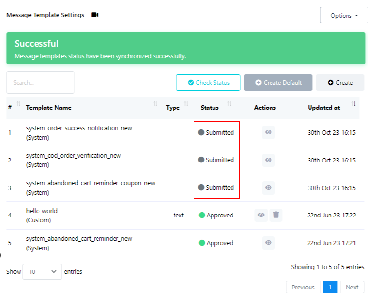 También hay un botón "Crear predeterminado". Al hacer clic en este botón, se pueden crear cuatro plantillas predeterminadas para el estado del pedido, la verificación de pedidos contra reembolso, la recuperación de carritos abandonados y la recuperación de carritos abandonados con plantillas de cupones. Antes de usarlas, también deben ser aprobadas por WhatsApp.