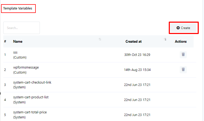 Puede utilizar variables de plantilla en la sección "Variable de plantilla". Además, si necesita crear una nueva variable, puede hacerlo haciendo clic en el botón "Crear" dentro de la sección "Variable de plantilla".