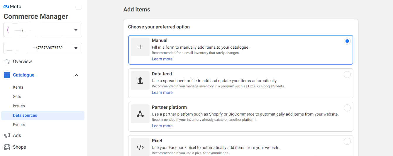 - Seleccione el método de carga (Subir información del producto o Conectar una plataforma asociada). Por ahora, seleccione Subir información del producto.